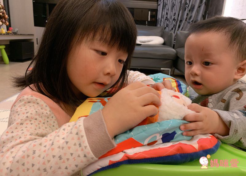 眼尖的柑仔看到新玩具...立馬過來說要陪弟弟玩,誰不知道她自己玩得比誰都還要入迷,布書有一隻互動小布偶(小羊),她還幫小羊取了個名字叫做「毛絨絨」,然後就自顧自的開始玩了起來,完全沒有顧慮一下弟弟的感受...