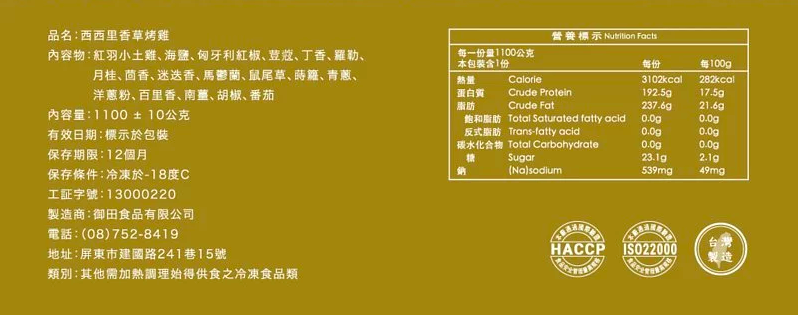成份:紅羽小土雞、海鹽、匈牙利紅椒、荳蔻、丁香、羅勒、月桂、茴香、迷迭香、馬鬱蘭、鼠尾草、蒔籮、青蔥