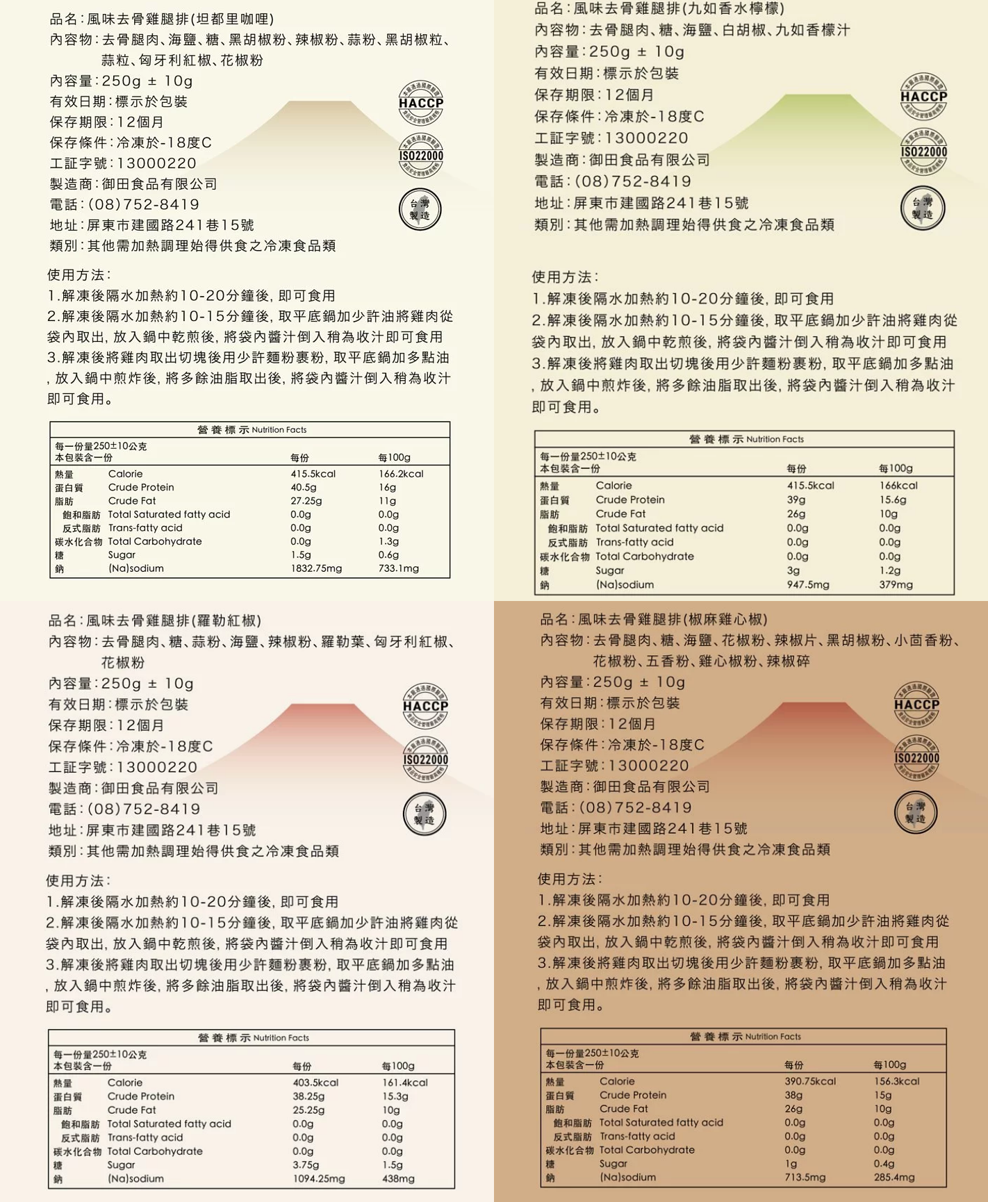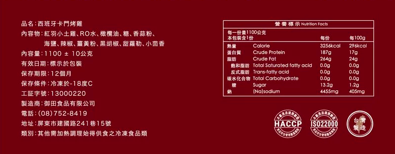 成份:紅羽小土雞、RO水、橄欖油、糖、香蒜粉、海鹽、辣椒、薑黃粉、黑胡椒、甜蘿勒、小茴