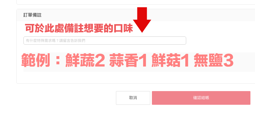 例如野菜雞高湯系列任選7包$899,但是想要自己搭,沒問題!只要選購高湯7包的組合(只要總數是7包都可以)再於訂單備註口味就可以囉(如下圖)