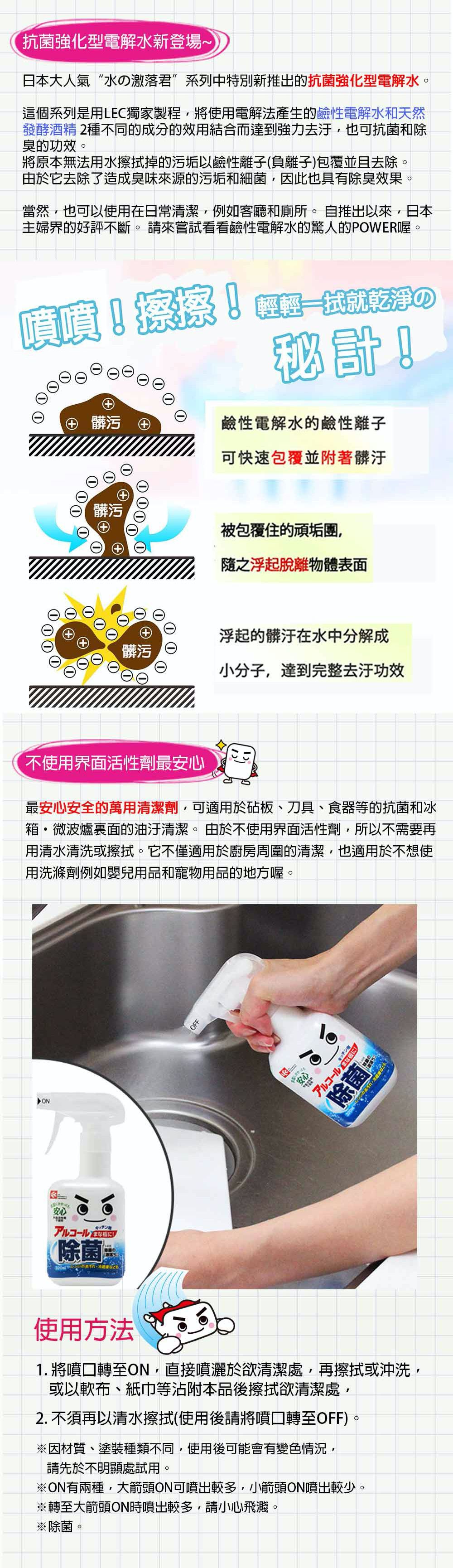 日本最新型電解水除菌劑,不含介面活性劑可安心噴在砧版、刀具、食器及廚房冰箱、微波爐內的清潔及抗菌,減少夏天因高溫而滋生細菌產生異味!電解水加發酵酒精的雙重功效,安心去污、除菌。