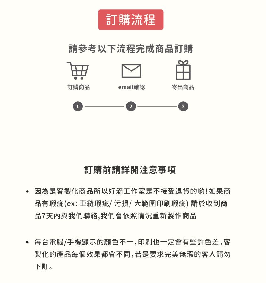 客製化商品需要較長的時間,等與媽咪確認照片後材開始印製,還請媽咪見諒~為縮短媽咪收到貨的時間,此預購團不再與其他商品合併。到貨後會依下單順序陸續出貨,較晚下單的媽咪就會比較晚收到貨喔! |