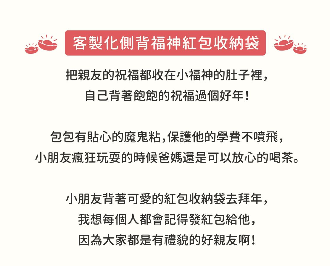寶貝過新年必備!可愛【DRIZZLE 好滴】客製化紅包收納袋,小寶貝拜年時可以背著,紅包絕對收好收滿!輕巧的小福神造型,也可以作為拜年造型喔~相信各個長輩眼睛是雪亮的(´⌣`ʃƪ)