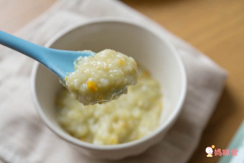蔬菜豬肉寶寶粥:豬高湯、米、小松菜、玉米、豬肉、地瓜。