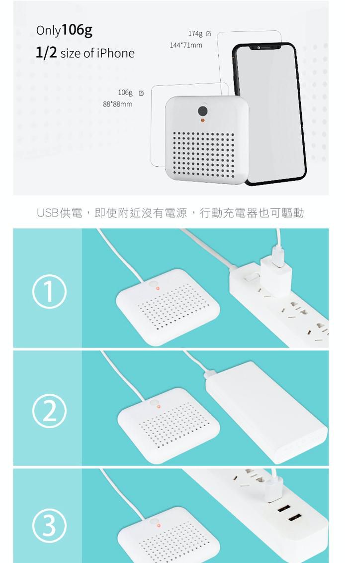 尺寸很迷你比手機還小,重量也只有106g左右(約一瓶養樂多)非常輕巧好攜帶,旅遊、出差時帶著也方便