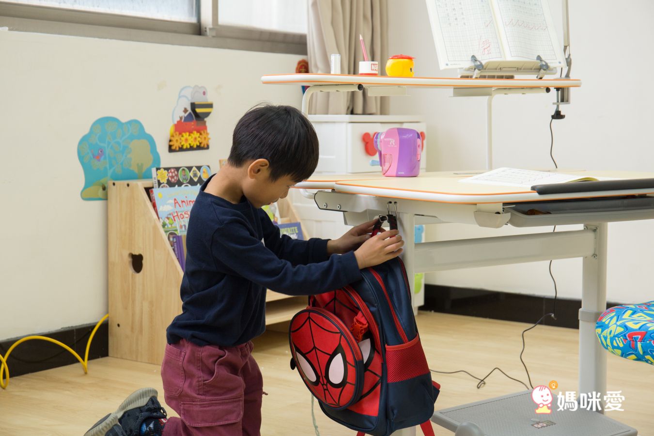 Aplus桌有書包掛架,可以掛書包、餐袋,教導孩子物品歸位的好習慣喔!