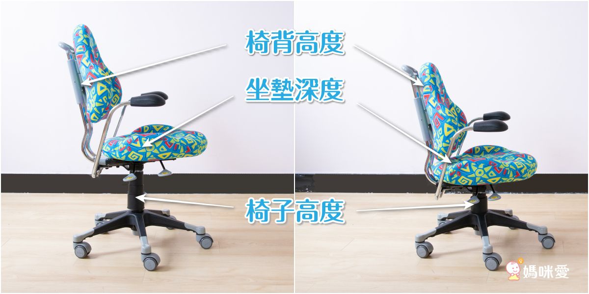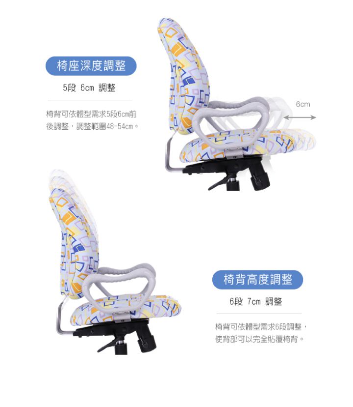 椅背高度4段共6cm、坐墊深度5段共5cm、椅子高度共有10cm可以調整,