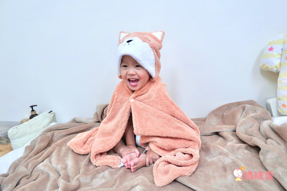 像這樣子洗好澡就幫寶貝披著不擔心著涼,可以等身體全乾了再穿上衣服也比較舒服