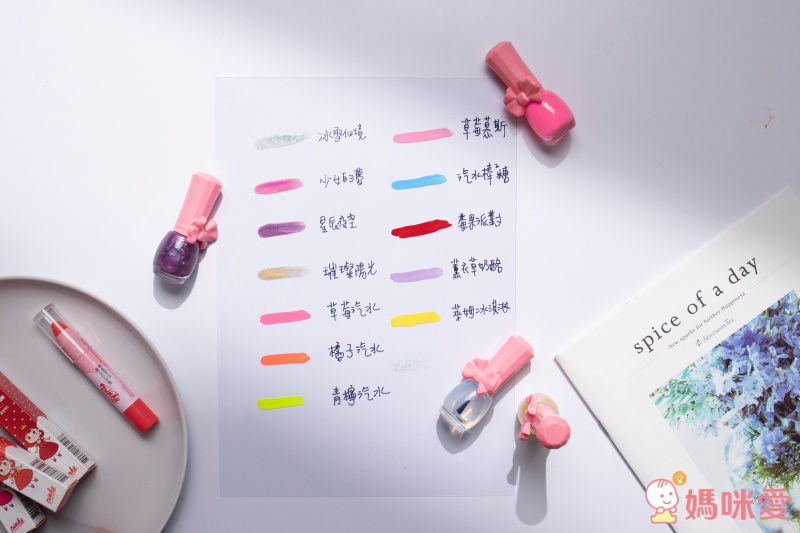 款式顏色(可以到下方看放大圖示喔):指甲油-冰雪仙境、萊姆冰淇淋、莓果派對、草莓汽水、秘境白光/潤唇膏-莓果紅/指甲貼-粉紅女孩、甜心粉紅/裝飾貼-彩虹日子、鑽石下午茶、甜甜圈派對/耳環貼-見下圖