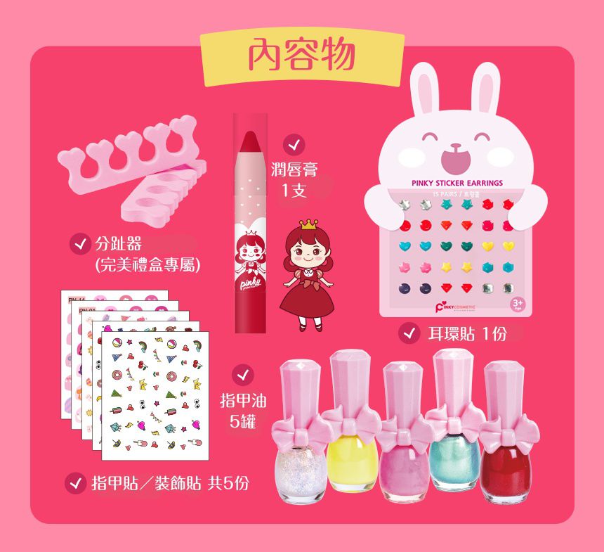 小女孩最喜歡的超浮誇多入禮盒組,這次也幫公主們準備好啦~指甲油、潤唇膏、耳環貼、指甲貼和裝飾貼,全部幫公主打包好!還有多附贈塗指甲油必備的分趾器喔~!!不只內容物超值,價錢更是非常可以噠,這樣才能叫完美禮盒!