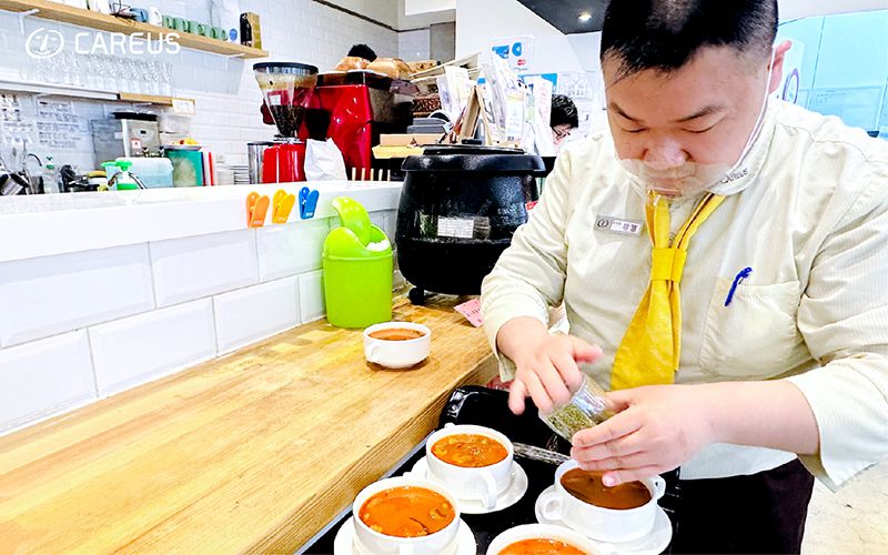 • 一位憨兒廚師,切菜備料專業俐落、擺盤上菜都在行。