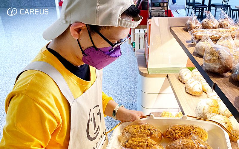 • 一位憨兒師傅,熟練的揉飪麵團、精準掌握烘烤時間。