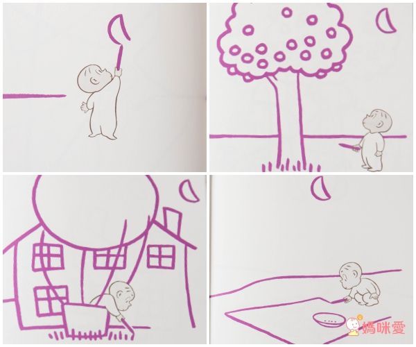 在阿羅的故事中,可以發現孩子的想像力真的太厲害啦~故事中沒有過多的文字,插圖也僅僅運用了線條和紫白兩色,便能引領大家進入充滿想像的國度,會讓人想不斷不斷地翻頁,看看阿羅的下一筆會揮灑出什麼樣的神奇世界喔!