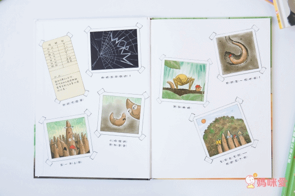 一翻開來,畫著蚯蚓覺得很有紀念性的東西,例如他的成績單、好朋友蜘蛛為他織的網、全家人去“堆肥島”度假的照片,完全把蚯蚓擬人化了!
