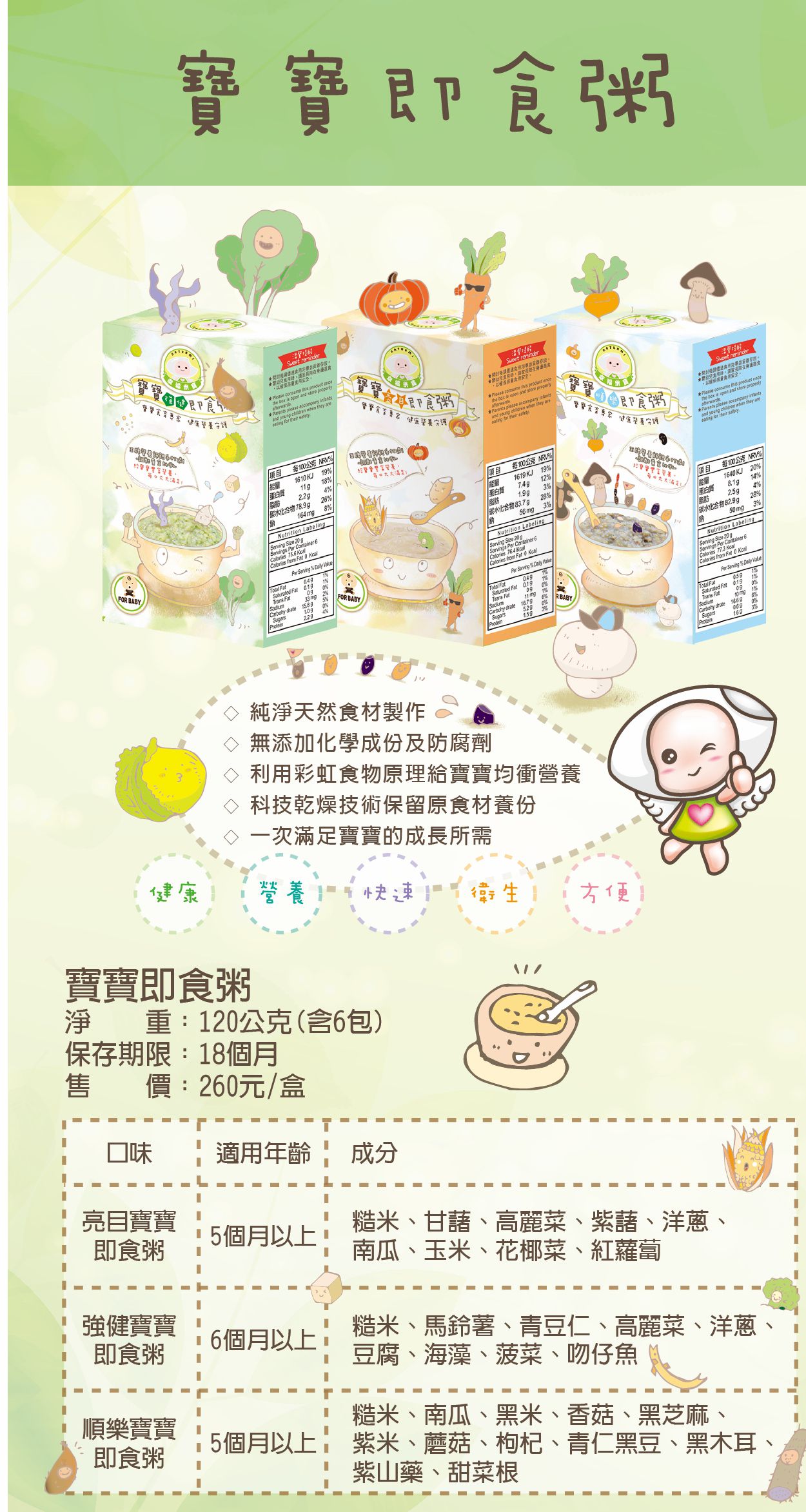 媽咪一定都有帶寶寶外出煩惱副食品的時候吧!在家還好解決,一出門首先要找熱水找容器,又不想讓寶貝吃冷冷的粥,這時候也可以選擇粉狀的寶寶粥唷!科技冷凍乾燥技術把蔬菜和米們磨成碎碎的粉末,直接保留了食物原本的營養,而且又攜帶方便~