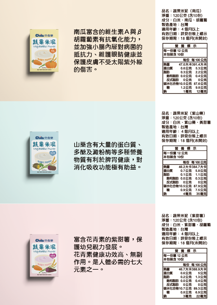 除此之外還有新品牌【Chila兒食樂】的寶寶粥和蔬果米泥,這次開團一次買齊全!,適合4~6個月以上的寶寶,也能讓寶寶嚐到更多元的味道唷!