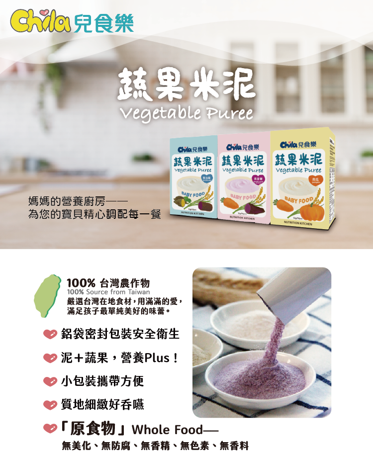 Chila 兒食樂的寶寶粥使用台灣在地安心食材,採用熱穿透高溫殺菌技術,並且通過食品工業發展研究所,證明可常溫保存喲!