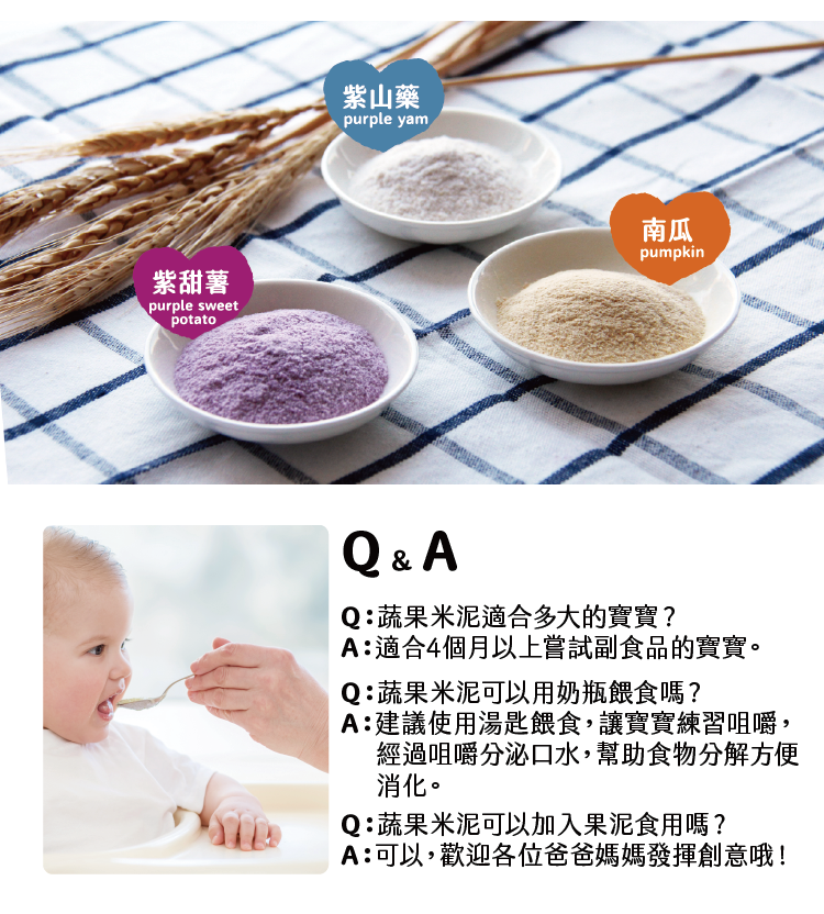 有山藥、紫甜薯、南瓜等等蔬果,能補充豐富的營養,質地十分細緻,寶寶好吞嚥,4個月以上的寶寶就可以食用囉~