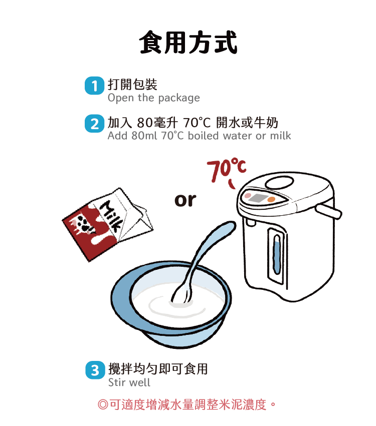 只需要用熱水沖泡,等待糊化5分鐘左右,寶寶粥也剛好變成適合入口的溫度,出門帶個保溫瓶非常方便呢!