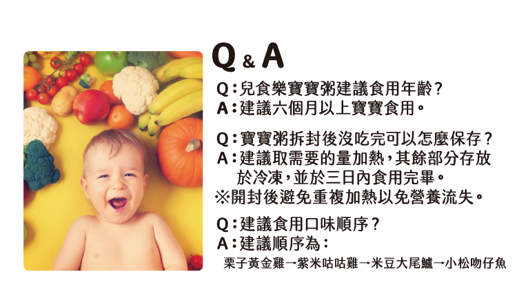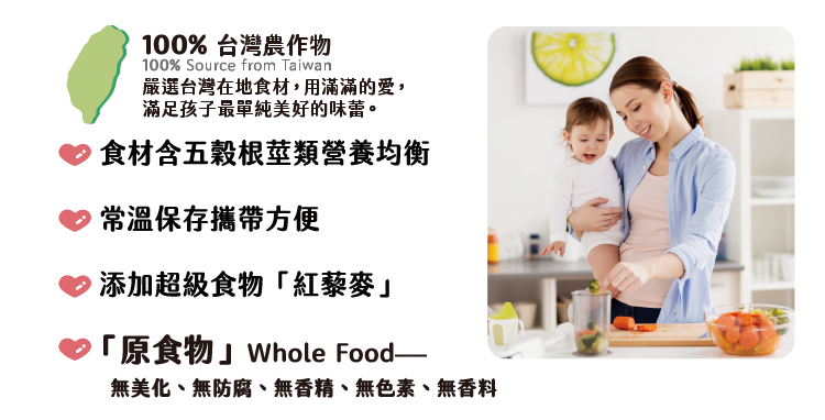 當中還添加超級食物——紅藜麥,無添加防腐劑、香精、色素、香料,只給寶貝食材原味的鮮美。