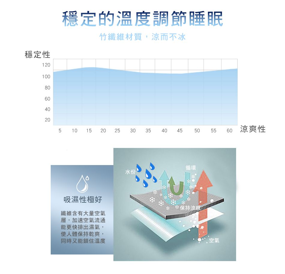 使用竹纖維能調節被子裡的溫度,保持在舒適的溫度,同時具備透氣、吸濕排汗的特性,比棉麻更舒服。