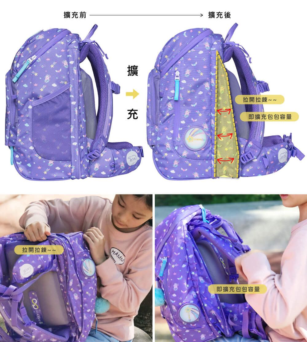 可擴充的低年級書包!該有的功能它全都有,還多了 5 公升的擴充容量,讓寶貝依據平常的需求自行調節!(2023年 22L款式沒有安全閃燈🚨)