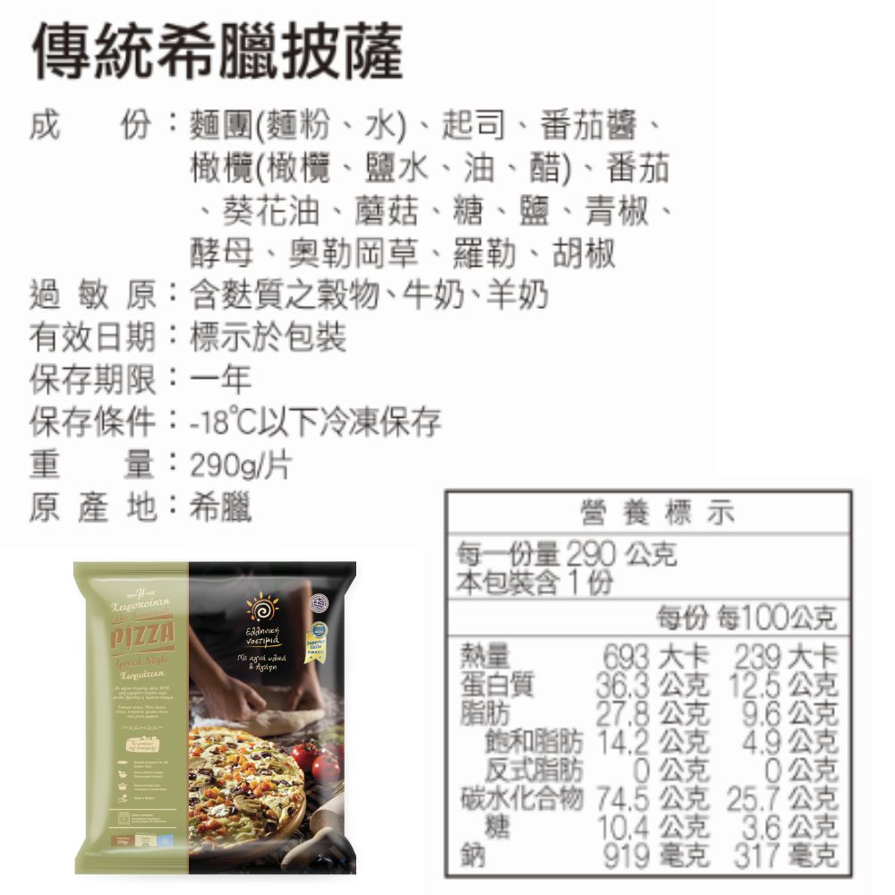 正宗地中海風味披薩 在地食材選用 原料嚴選,蕃茄與橄欖都使用希臘在地栽種,菲達起司更是歐洲PDO認證(原產地名稱保護制度),成分有保證! 用料單純自然,餅皮使用手工揉打麵團,口感Q彈紮實有嚼勁,呈現道地希臘風情! 產品成分天然單純,更榮獲「iTQi風味認證」,每一口,都品嚐得到最美味天然的歐洲風味!