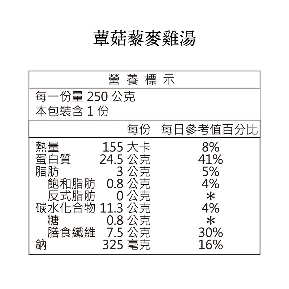 義大利麵(小麥、水)、水、芥花油、洋蔥、九層塔、香菇、蘑菇、蒜、草菇、糖、乳酪、杏仁、鹽、洋菜、胡椒、香菇粉(香菇粉抽出物、糊精)、酵母消化蛋白質(酵母抽出物、糊精)、香辛料(奧勒岡葉、羅勒葉、迷迭香葉、蒜粒、紅辣椒、馬郁蘭葉、洋香菜葉)