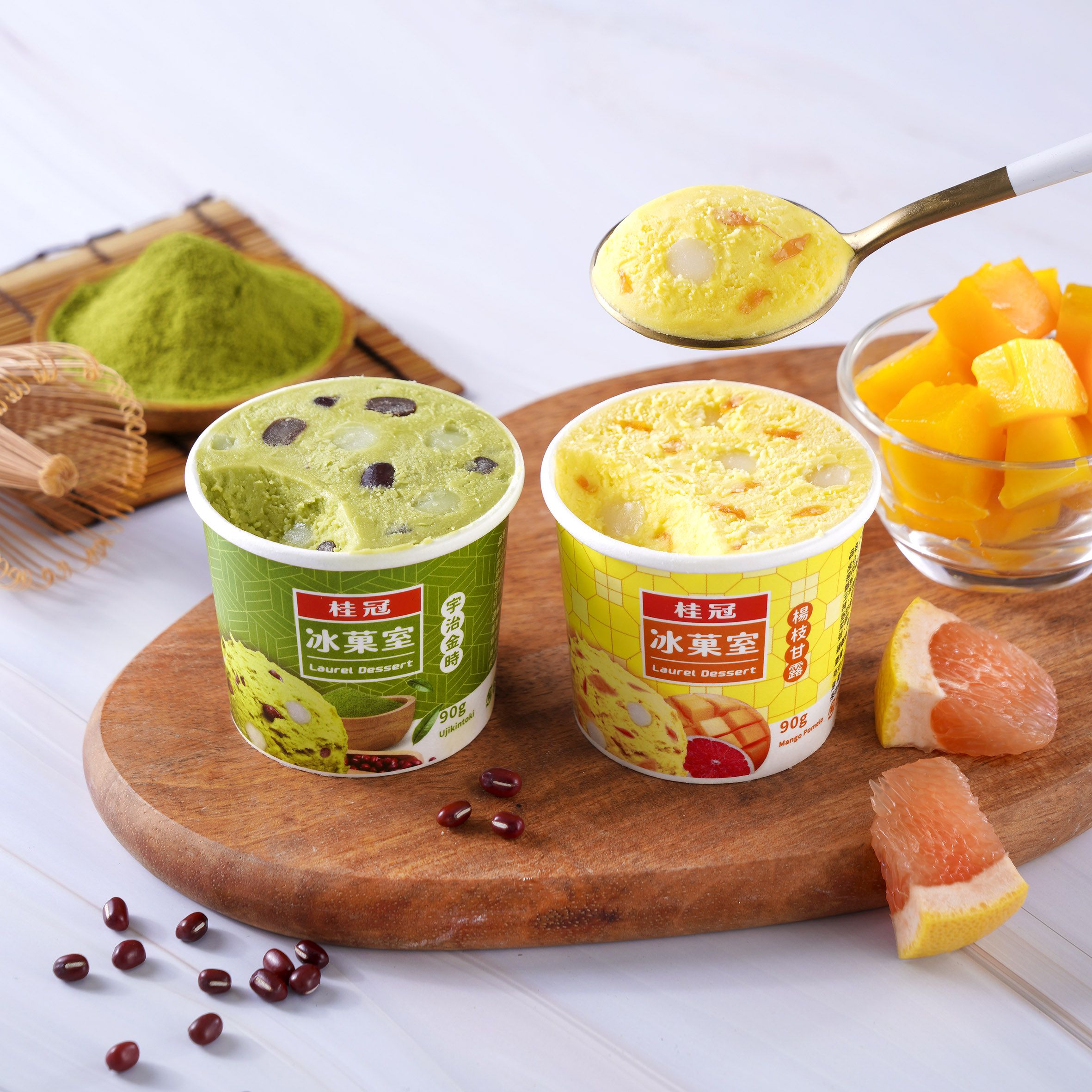 【楊枝甘露冰淇淋 90g/杯】:神複製港式甜品口味,特選愛文芒果,香甜消暑 以清爽的芒果奶冰為基底,特選愛文芒果香氣十足,融入紅柚果肉與淡淡椰奶香氣做提味,加上Q彈白玉增添口感,一入口就有滿滿的芒果香,酸甜消暑不膩口。