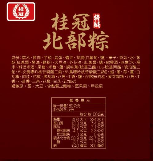 麵粉、水、豬肉、蛋皮(蛋、水、馬鈴薯澱粉、鹽)、糖、醬油、脫水高麗菜(高麗菜、葡萄糖)、筍、荸薺、乳化油(棕櫚油、大豆油)、豬油、酵母(天然酵母、水、卵磷脂)、紅蔥頭、馬鈴薯澱粉、芝麻油、香菇、鹽、黑胡椒粉、紅椒色素、辣椒粉