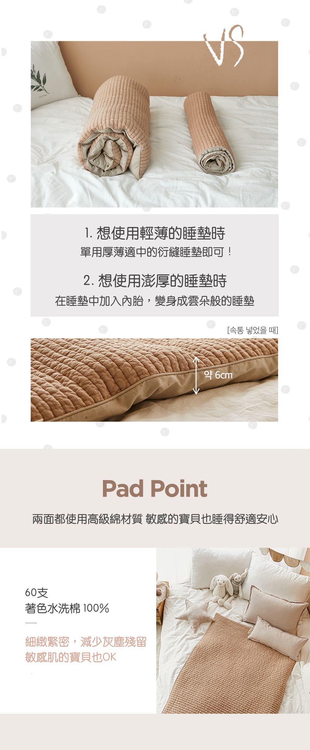 請媽咪選購時留意「60支高密度棉防蟎睡袋」的睡墊僅有2cm睡墊、「6cm厚墊60支高密度棉防蟎睡袋」才是有含6cm內胎加購的選項喔!
