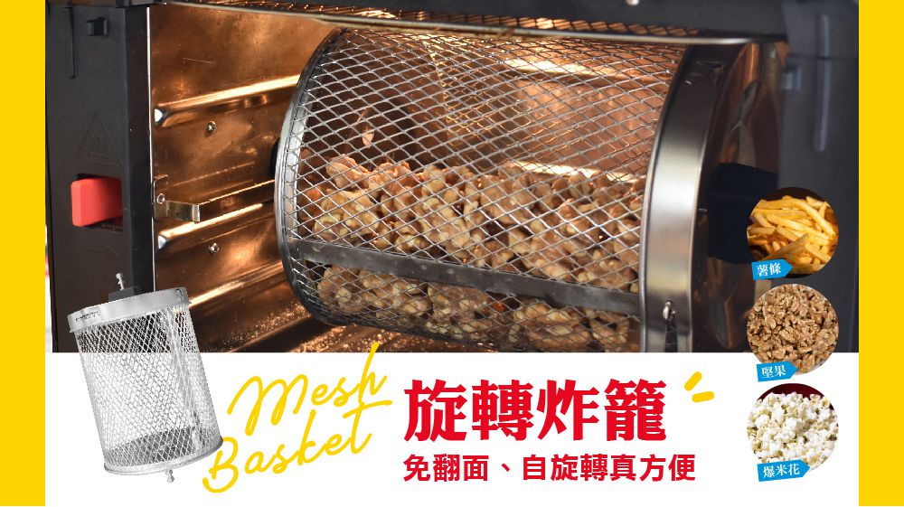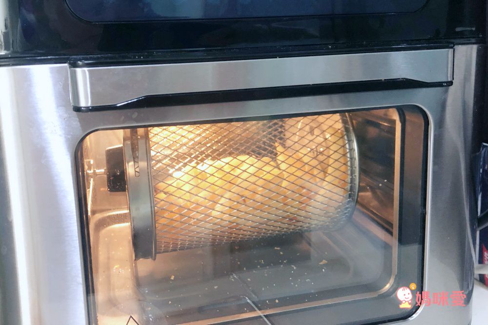 想烤薯條、小丸子等等點心很適合用這個網籠,因為網籠會轉動裡面的食材也會跟著不停翻轉,就像烘衣機那樣子,每個部分都可以受到非常均勻的加熱喔!
