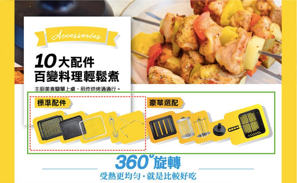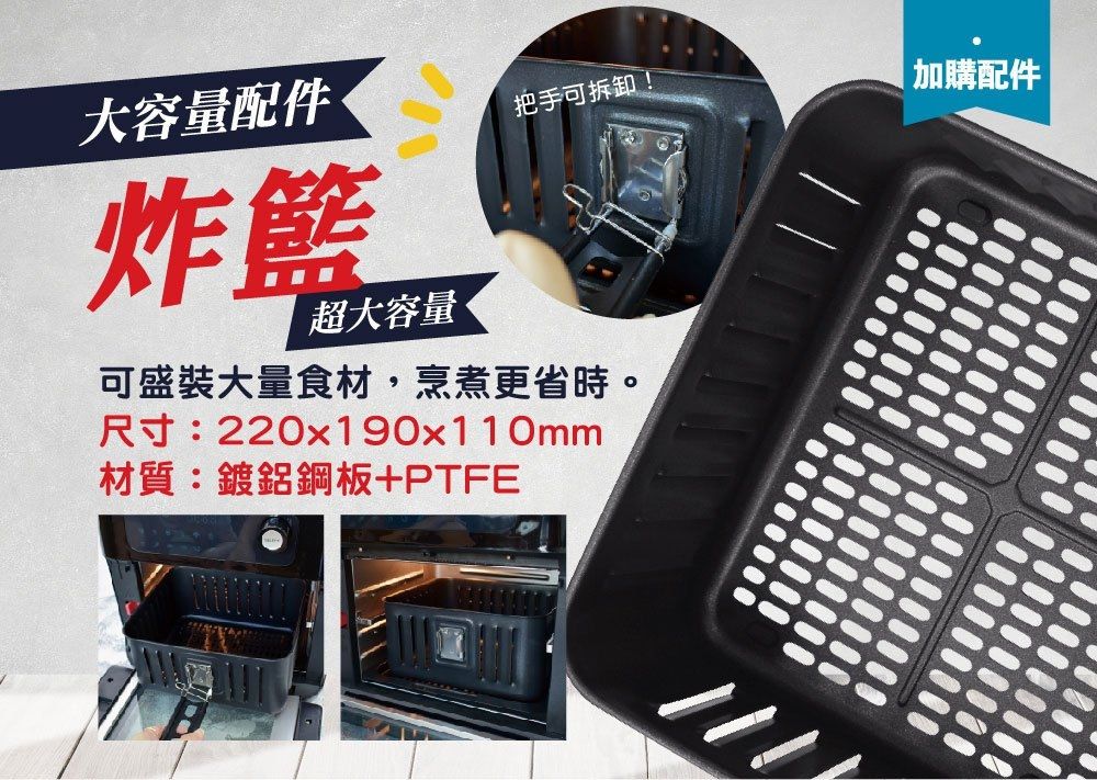 本次十全十美組合,是有含一個炸籃配件喔!大容量的炸籃十分好用,當需要烹調大量的薯條或是炸雞塊就可以使用 (但中途要打開門拉出來 翻動食物使其氣炸均勻)!或者鮭魚、牛排 等比較體積較重較大的食物,又不想使用烤盤時,炸藍也很方便使用!