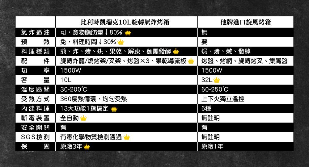媽咪可以一起參考官方資料,能對比利時 KALORIK 旋轉氣炸烤箱有更多暸解!