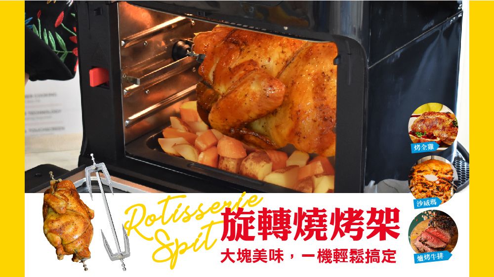 比利時 KALORIK 旋轉氣炸烤箱,因為熱循環好升溫快、加熱又平均,可以快速讓表面烤熟,抓住醬料、把肉汁鎖在裡面