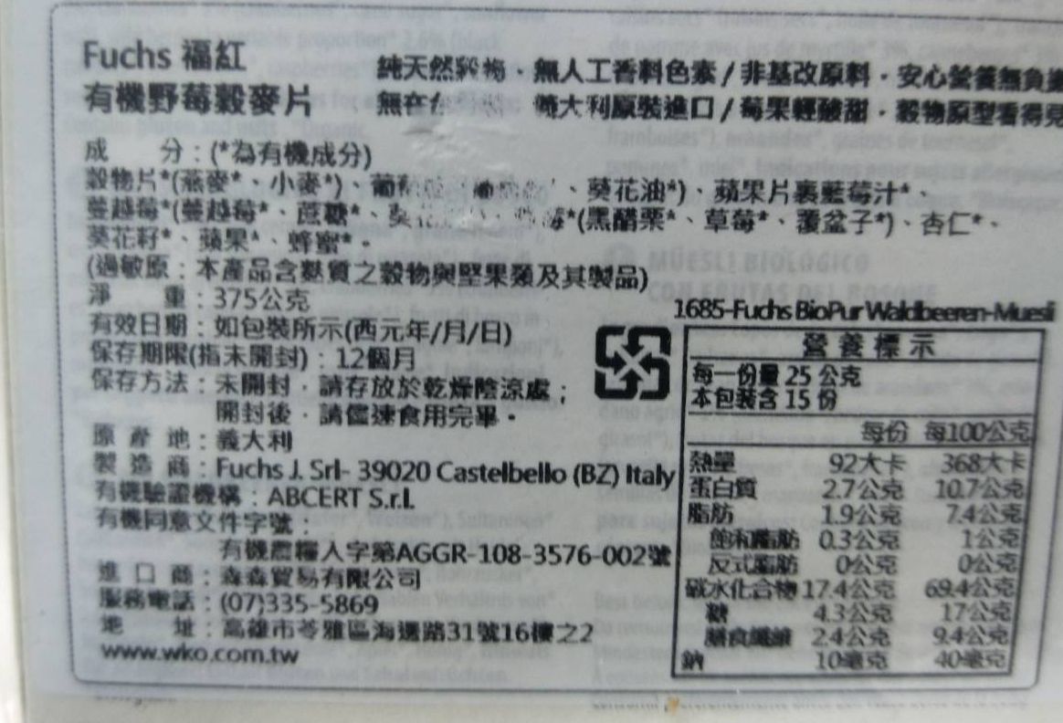 有機野莓穀麥片成分:穀物片*(燕麥*、小麥*)、葡萄乾*(葡萄乾*、葵花籽油*)、蘋果片裹藍莓汁* 3%、蔓越莓*3%(蔓越莓*、蔗糖*、葵花籽油*)、野生莓果* 2.6%(黑醋栗*、草莓*、覆盆子*)、杏仁*、葵花籽*、蘋果*、蜂蜜*。(*為有機成分)
