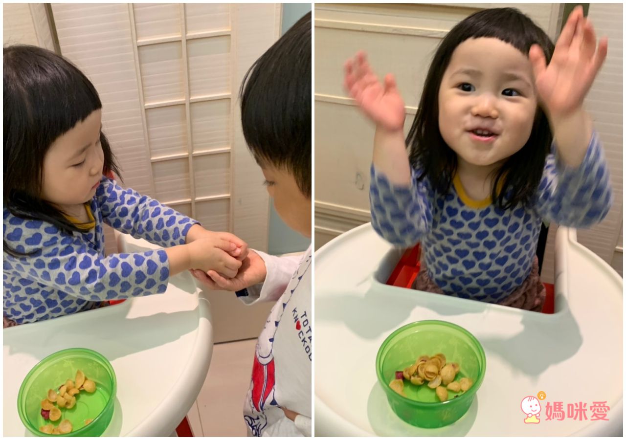 因為食材很天然,所以也放心給孩子當成平常的點心吃!兩歲多的檸檬有了點心就開心地拍拍手,還很大方的分享給哥哥呢~