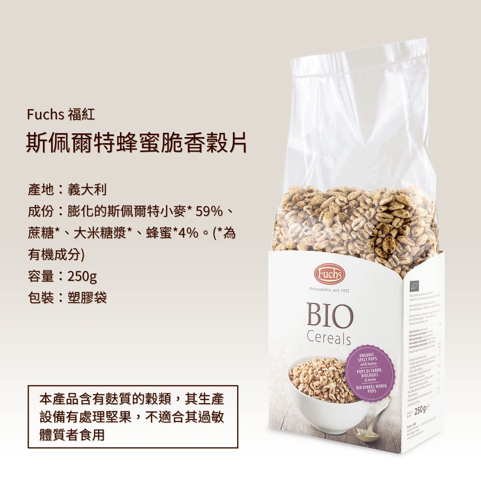另外一款很特別的是這個「有機斯佩爾特蜂蜜脆香穀片」,吃起來有點像爆米香,它是使用歐洲斯佩爾特小麥膨發、壓片、烘乾,最後再包裹一層有機天然蜂蜜!