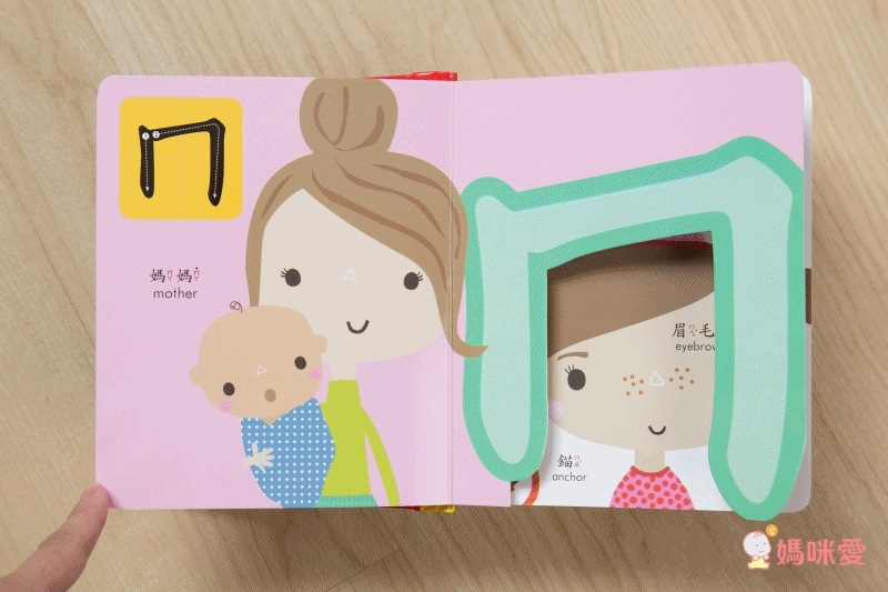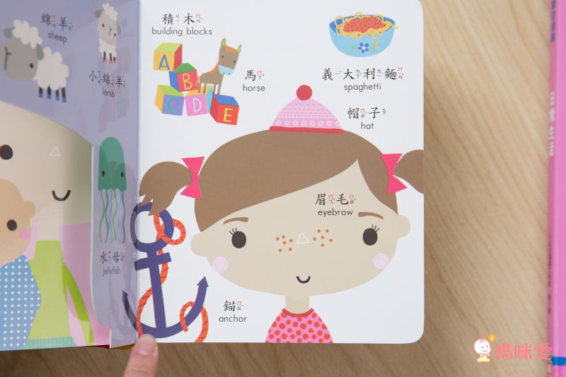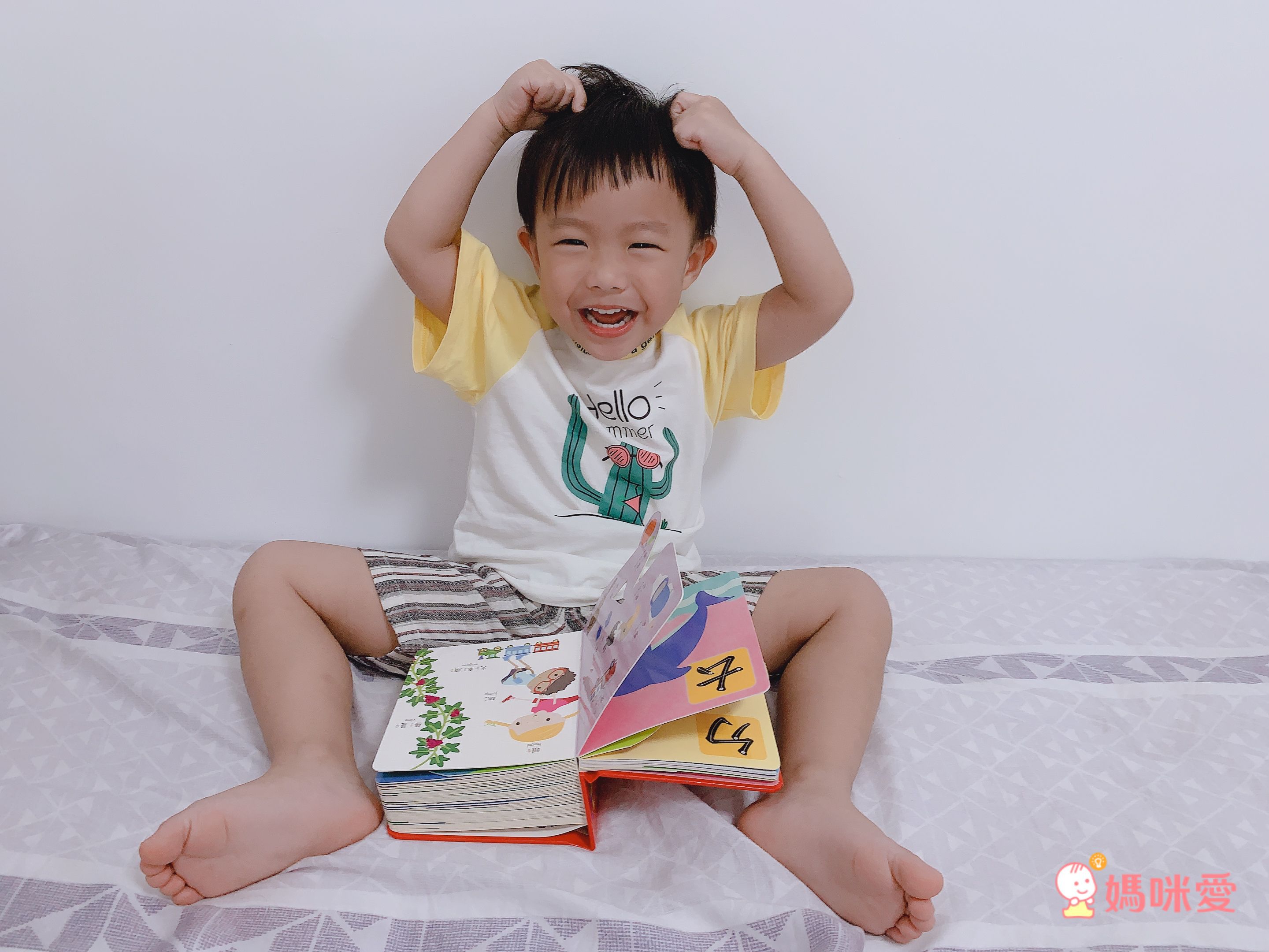 我們講到 ㄊ 頭髮的時候,媽媽問了花生米 頭髮在哪裡~?花生米馬上比出來,也覺得這樣的互動很有趣!清晰大字+可愛大圖案,讓孩子馬上連結單字,翻著玩著就記住啦^^