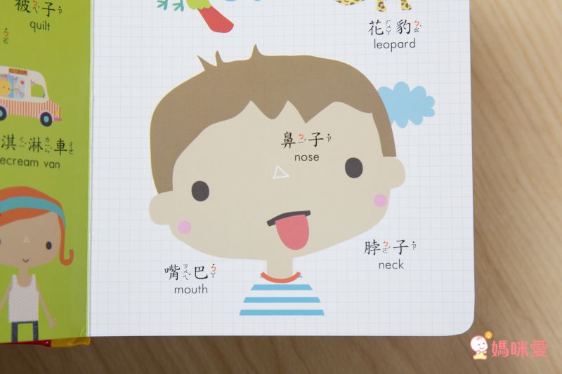 而且光是一個注音ㄅ,對應的單字就多達 13 個:鼻子、脖子、嘴巴、被子、蠟筆、冰淇淋車.....都是日常生活中會遇到的單字呀!頁面特殊鏤空與軋型設計,還可以和孩子一起玩猜一猜遊戲;年齡稍大的孩子,還可試著用圖片來編故事,提升口語表達能力。