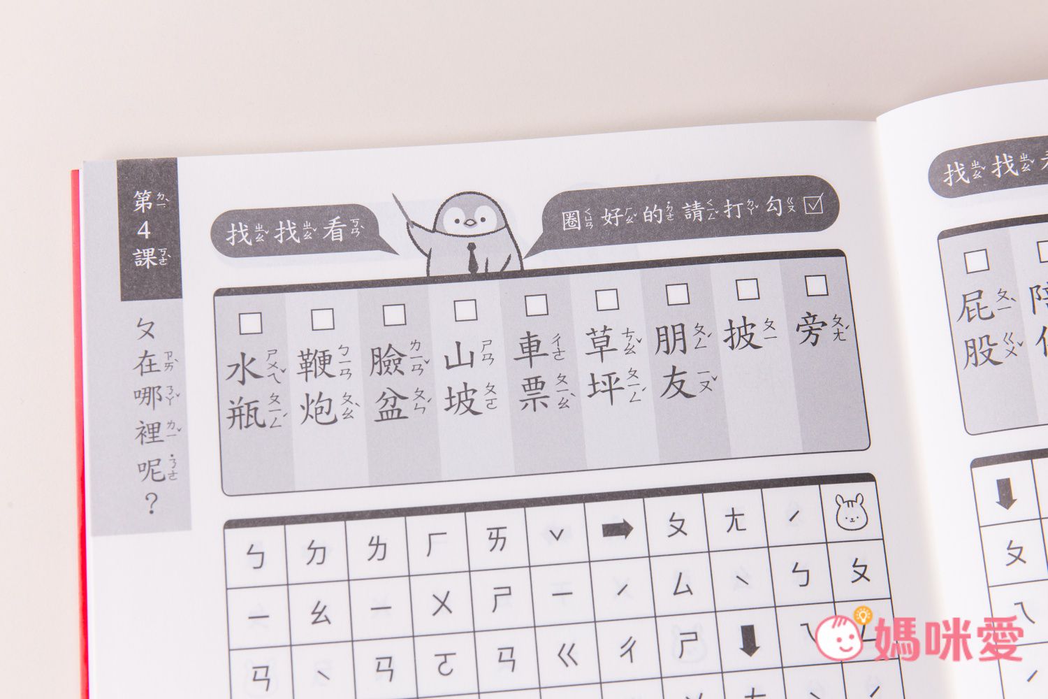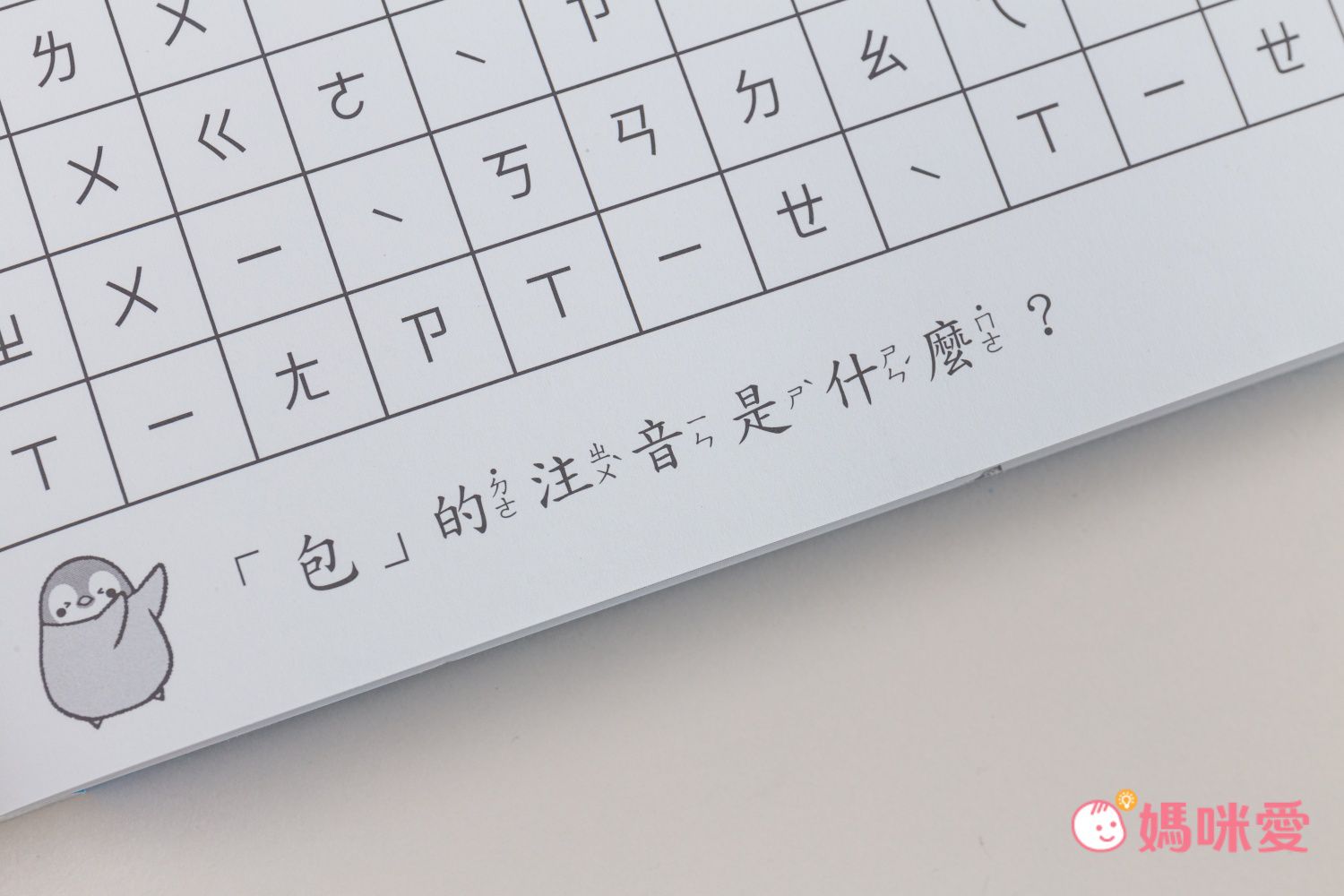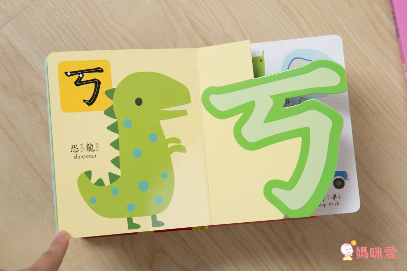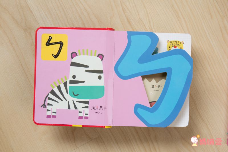 每頁都是一個注音符號,學習單純不複雜,加深孩子印象。當孩子翻著書本,指著字母問爸媽:「這是什麼?」爸媽便可先指導孩子認識住音符號、練習發音,用手指在注音字上練習書寫筆畫,之後再以模仿和實際物品來示範,引導孩子理解書中的可愛圖片是動物、植物、交通工具還是生活用品,並逐漸學會它們的中、英文名稱。