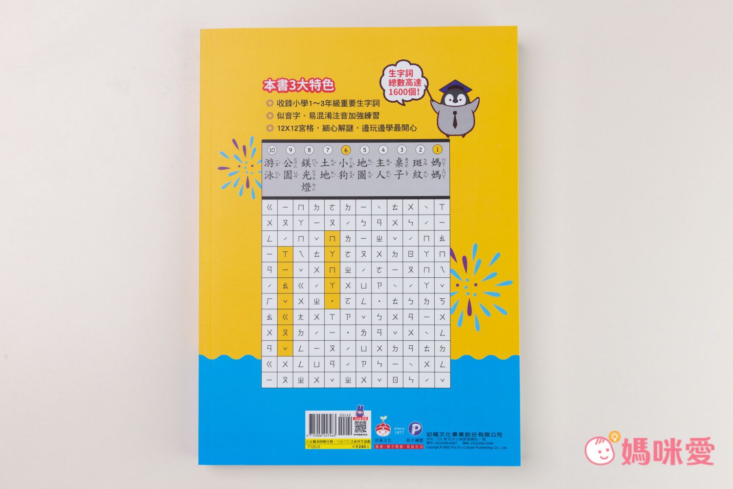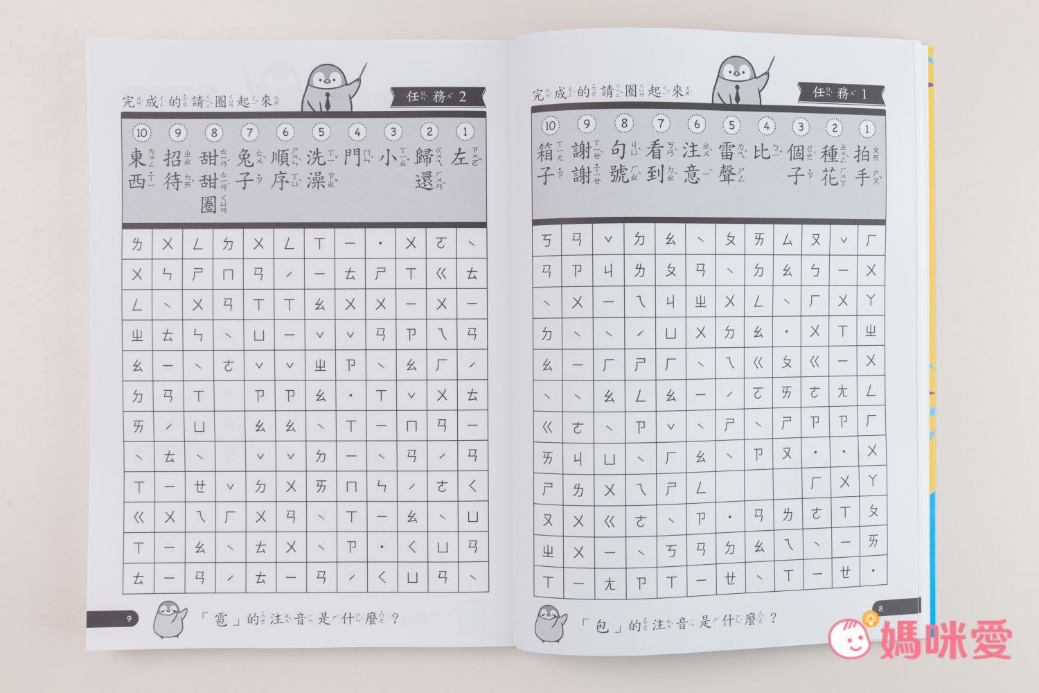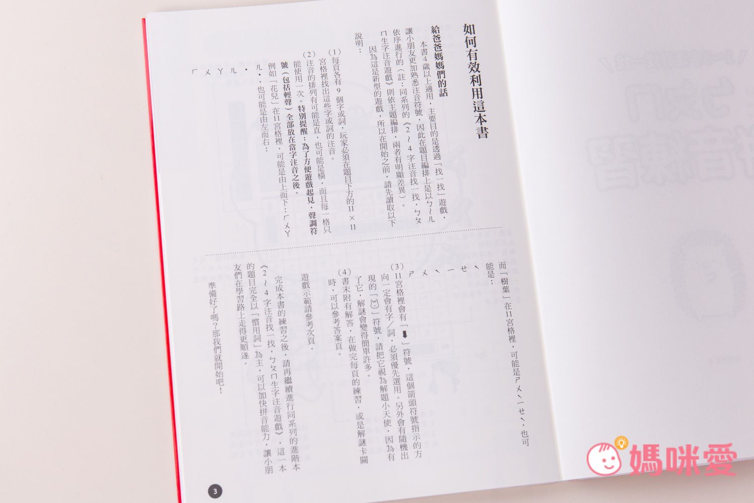 每頁都是一個注音符號,學習單純不複雜,加深孩子印象。當孩子翻著書本,指著字母問爸媽:「這是什麼?」爸媽便可先指導孩子認識住音符號、練習發音,用手指在注音字上練習書寫筆畫,之後再以模仿和實際物品來示範,引導孩子理解書中的可愛圖片是動物、植物、交通工具還是生活用品,並逐漸學會它們的中、英文名稱。