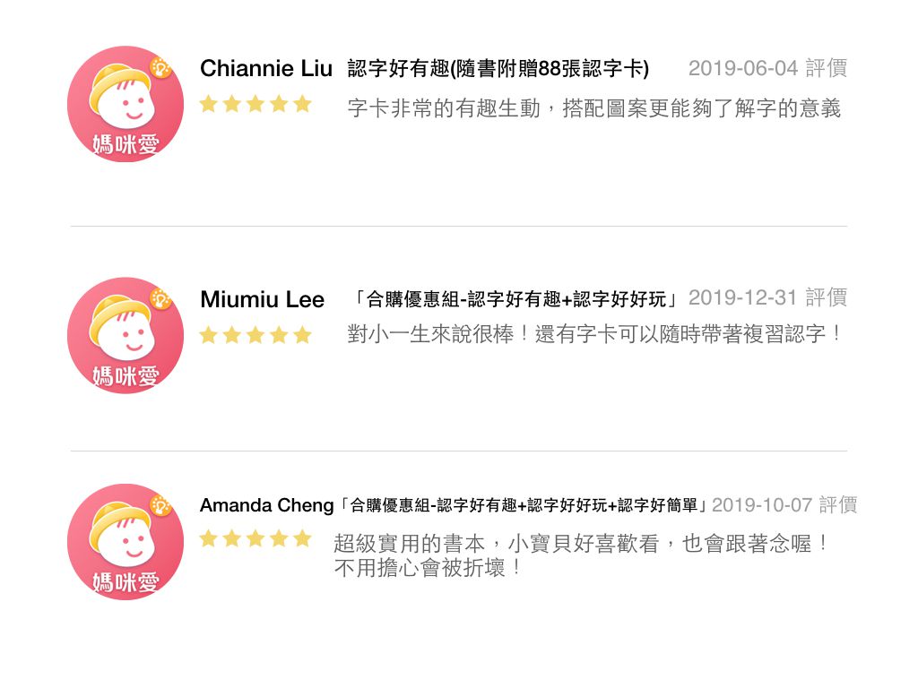 媽媽前面兩冊都買了,當然不會錯過第三本啊!認字系列的童趣畫風跟市面上認字書完全不同,可以馬上抓住孩童目光!安安第一眼就找到他名字裡面的字了呢!