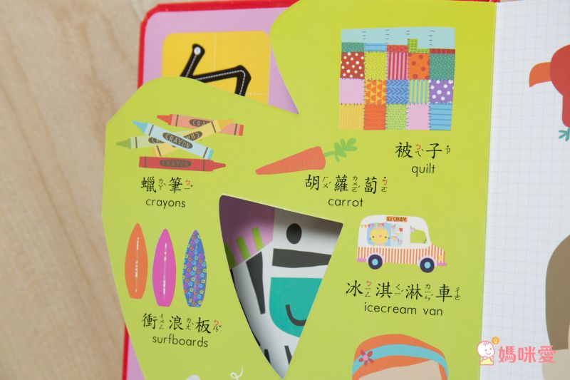 不過小班的花生米還沒開始學ㄅㄆㄇ,所以媽媽就先讓花生米認識裡面的各種物品,不僅可當認知書~大一點延續學習ㄅㄆㄇ很划算耶!書頁上有特殊的摟空剪裁很吸引兒子翻頁的興趣喔!