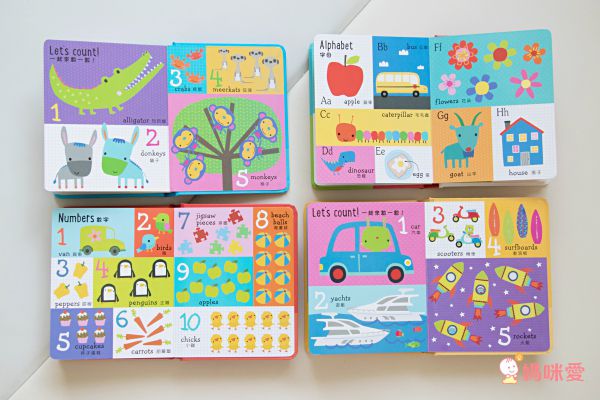最後最後,帶來來自英國的低幼寶寶厚頁認知書,一共有四套,包含「幼兒美語基礎單字」、「動物朋友」、「跑跑汽車」、「字母、形狀、顏色、數字」主題。