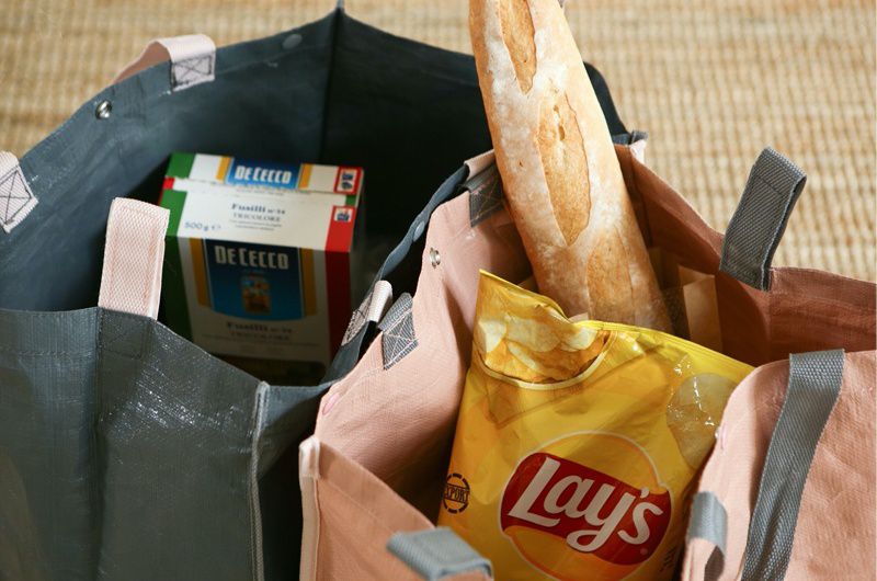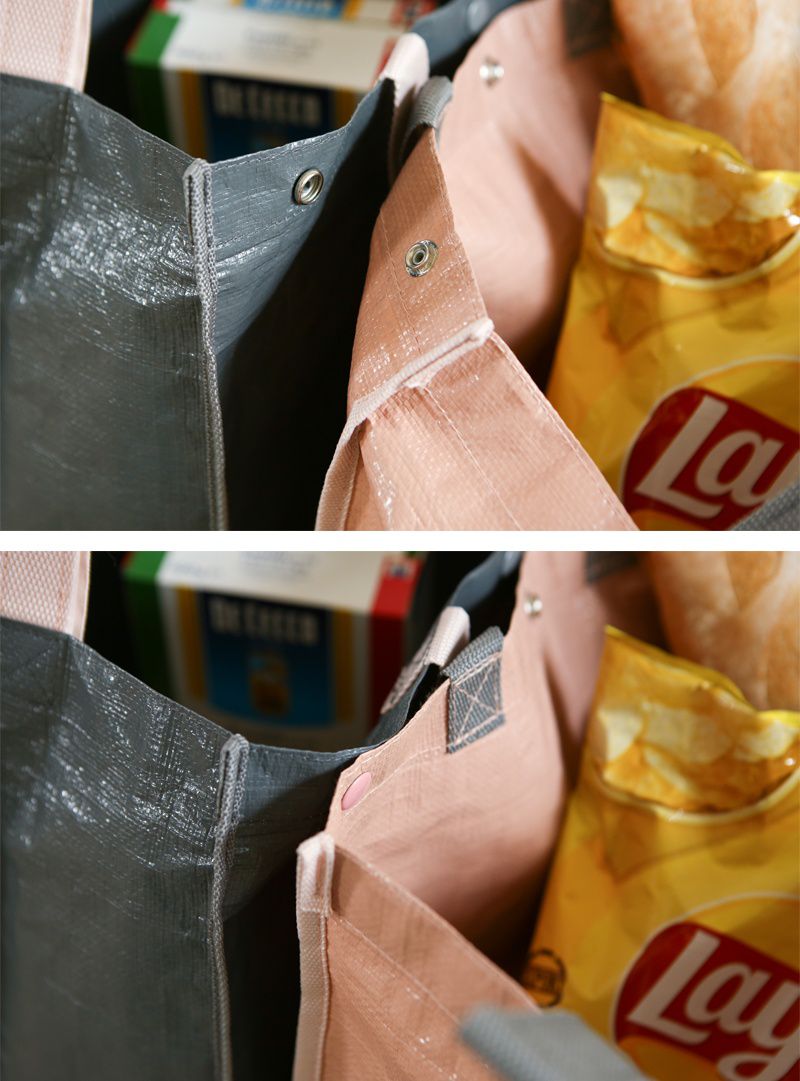 每個袋子兩側都有三個釦子,可以將兩個購物袋連接再一起~買完東西分類好可以直接當收納箱放好,不怕散掉!