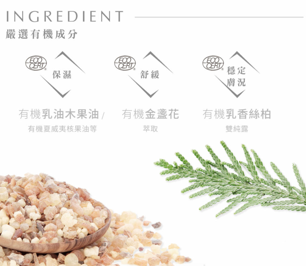 選用有機乳香絲柏純露、有機植物油及多種天然植物萃取精華製成。深度滋潤肌膚同時,更可提升肌膚屏障!產品無添加矽油、礦物油、人工香精及精油,全膚質都能安心使用!
