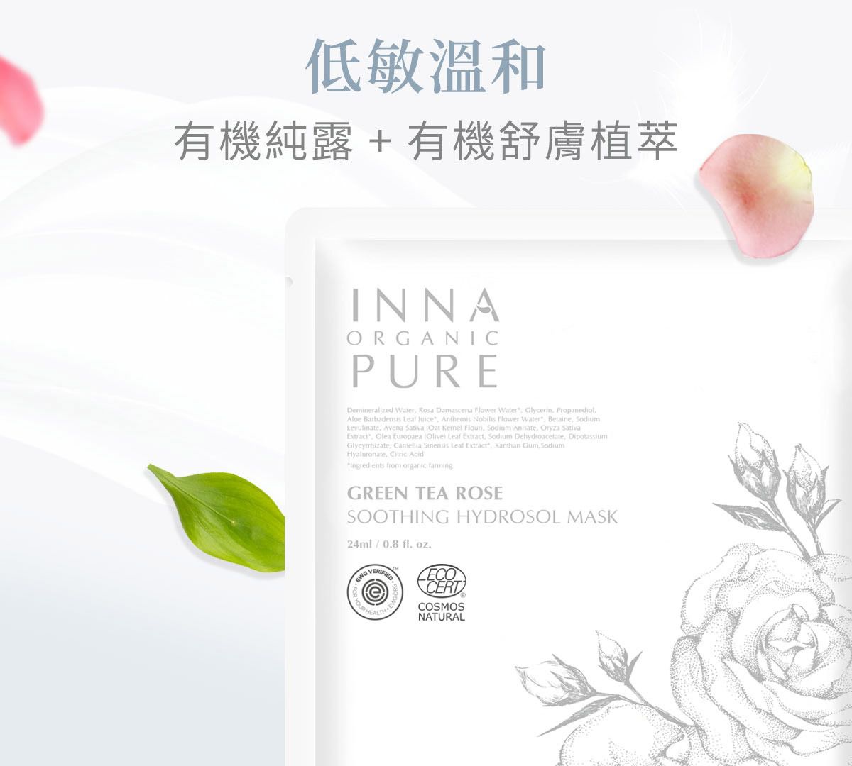 「綠茶玫瑰面膜」主要成分是有機玫瑰複方純露、有機綠茶萃取以及燕麥舒膚精華!