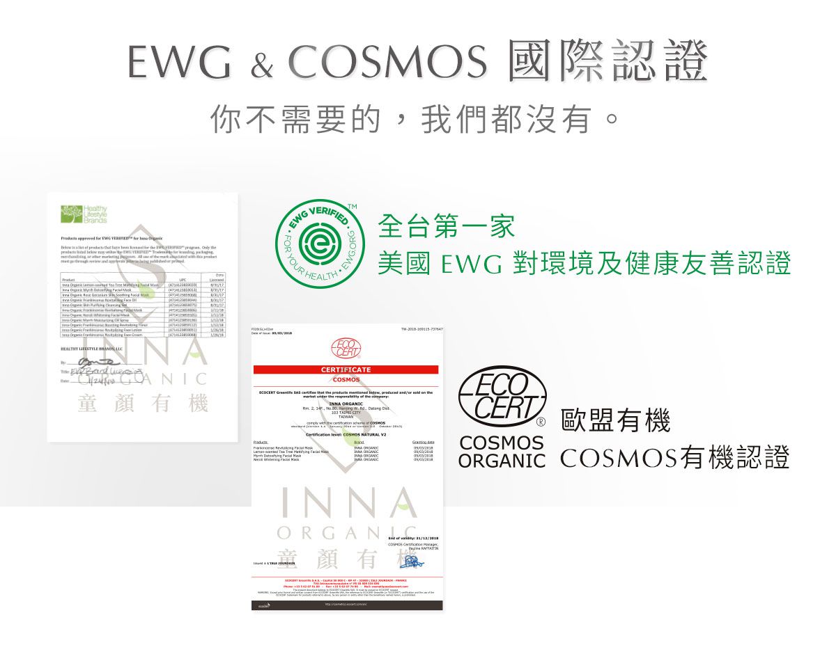童顏有機不但通過了「歐盟 COSMOS 有機/天然認證」,更是台灣第一家拿到「美國環境工作組織 EWG 認證」的品牌!