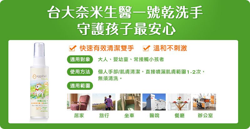 育有兩兒的檸檬媽特別推薦【小鹿山丘 台大奈米生醫一號乾洗手】,帶著寶貝出門吃東西前雙手清潔,就可以噴噴啦!